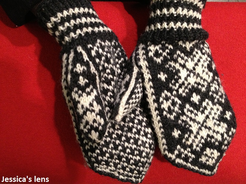 On the one hand I’m kind of annoyed by the person who decided to break into our store room in the basement. There really was nothing of value there, too bad they broke the door in half. They might have taken some old tools, I hope they enjoy them. On the other hand I’m happy I got this picture of another pair of beautiful mittens. They are knit by the mitten-owner’s grandmother.